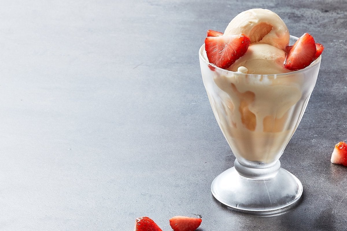 - For at servere, så scoop ud og top med dine favorit toppings. Vi har gået med friske jordbær.