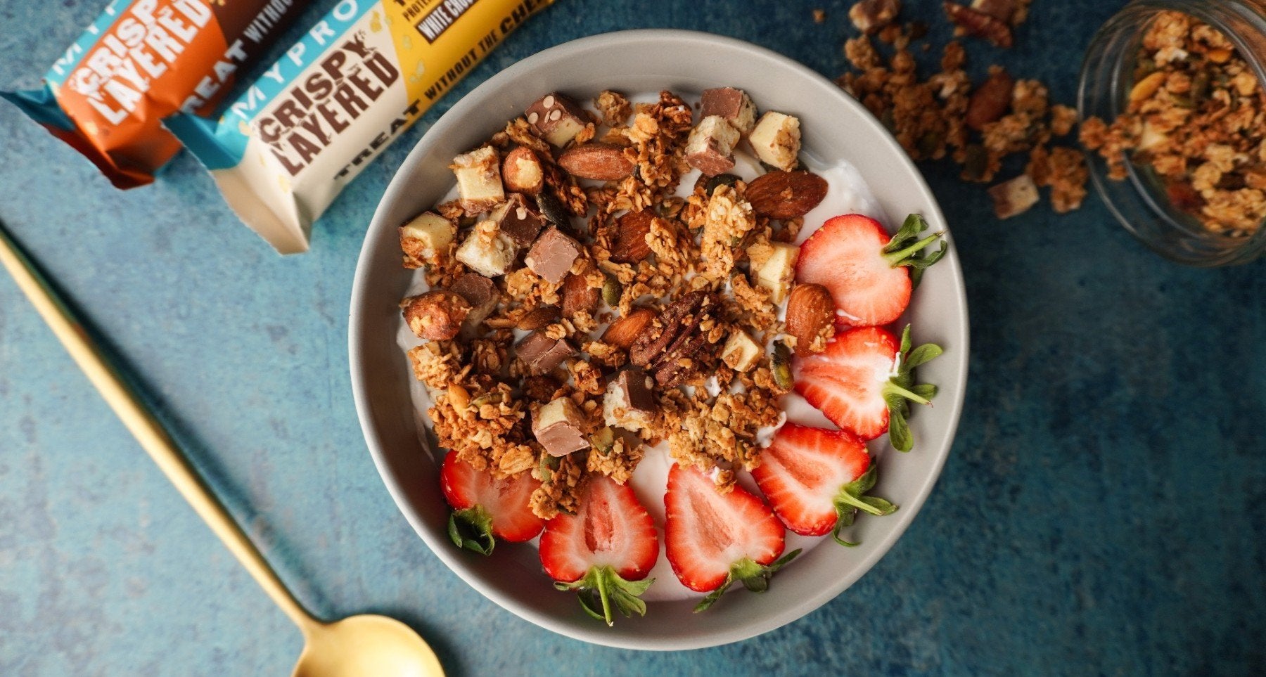er en sød og enkel måde at kontrollere præcis, hvad der kommer i din blanding, og den kan tilpasses med alt det ekstra, du har lyst til - rosiner, tørret frugt, chokoladestykker, hvad du har lyst til.Hun har skiftet det raffinerede sukker ud med naturlig ahornsirup og har tilføjet masser af uimodståelige klumper af vores helt nye Crispy Layered Bar for at tage tingene til det næste niveau. Har du ikke hørt om disse endnu? Vi er sikre på, at de snart vil være i din top 3 over alle protein snacks nogensinde. Ja, så meget bakker vi virkelig op om os selv.