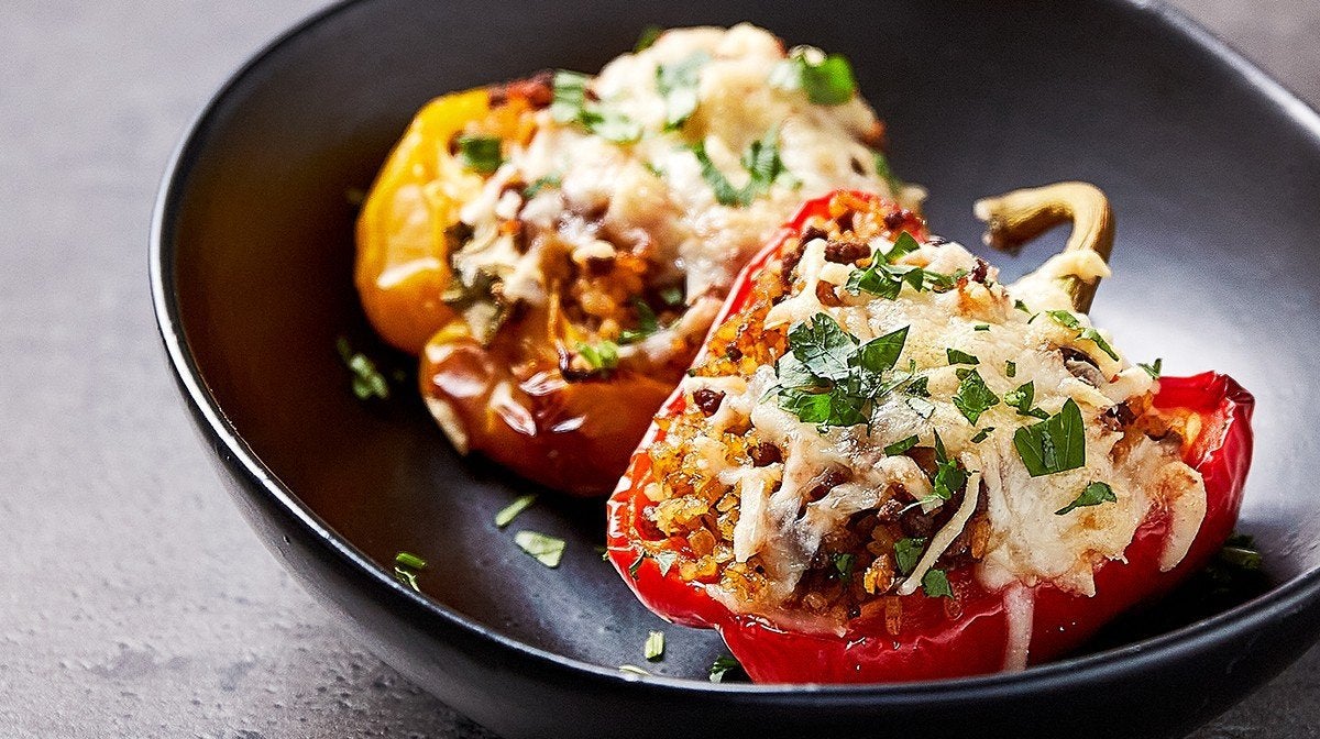 Denne hurtige og nemme opskrift på fyldte peberfrugter med oksekød og bulgur er den perfekte måde at få en sund servering af lavt GI-kulhydrat, da de er fyldt med bulgur, som er et fuldkorn, der indeholder store mængder vitaminer, mineraler og fibre. De har også fået et godt proteinindhold takket være den velsmagende fyld af oksekød. Ideel til at hjælpe dig med at nå disse daglige mål.