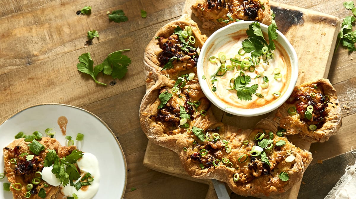 #7 Bag i ca. 20 minutter, inden du tager ud af ovnen, og server med en skål frisk creme fraiche i midten. Skær i passende stykker og nyd med god samvittighed!