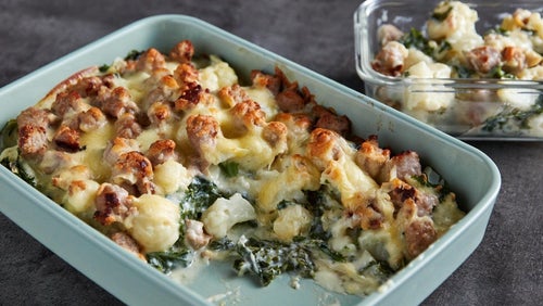- Bag i ovnen i 10 minutter, indtil halloumi-kanterne begynder at blive brune. Servér straks, eller portionér det i dine meal prep beholdere til din frokost senere på ugen. Det passer perfekt til couscous.