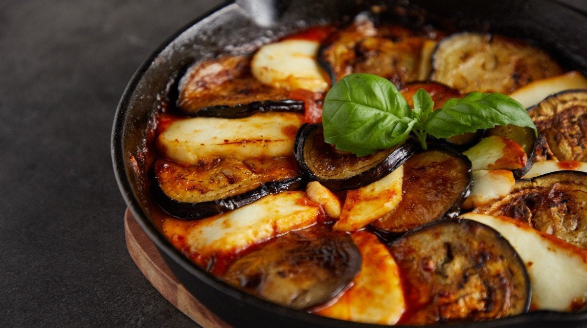 - Varm først 1 spiseskefuld olie op i en stor ovnfast pande. Steg aubergineskiverne i et par minutter på hver side, indtil de er godt brunede, og tag dem derefter af panden og sæt dem til side.