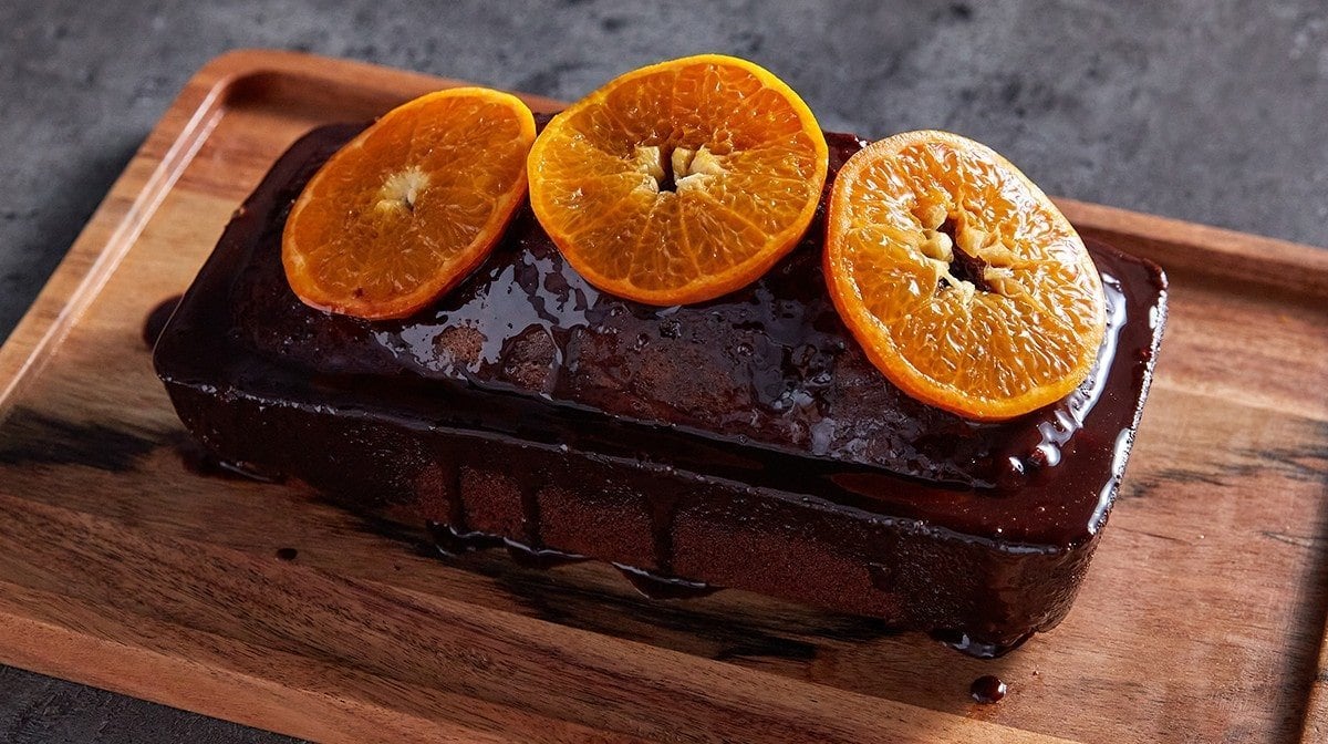 - Når den er bagt, skal du tage den ud af ovnen og stikke forsigtigt brødkagen overalt med en tandstik. Hæld derefter den orangechokoplade-glasur over toppen af kagen, og lad den køle af i 10-15 minutter.