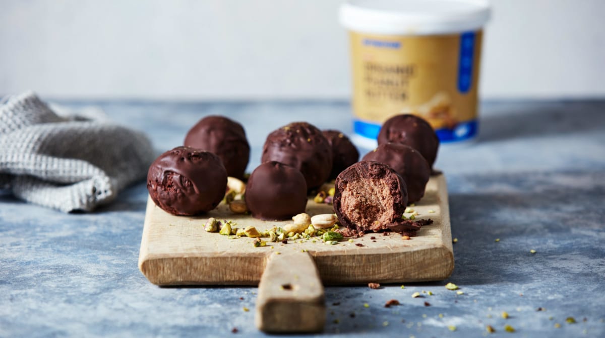 - Tag peanut butter blandingen ud af fryseren og brug en ske til lave scoops. Brug dine hænder til at forme runde kugler og læg på en bakke. Frys i yderligere 15 minutter.