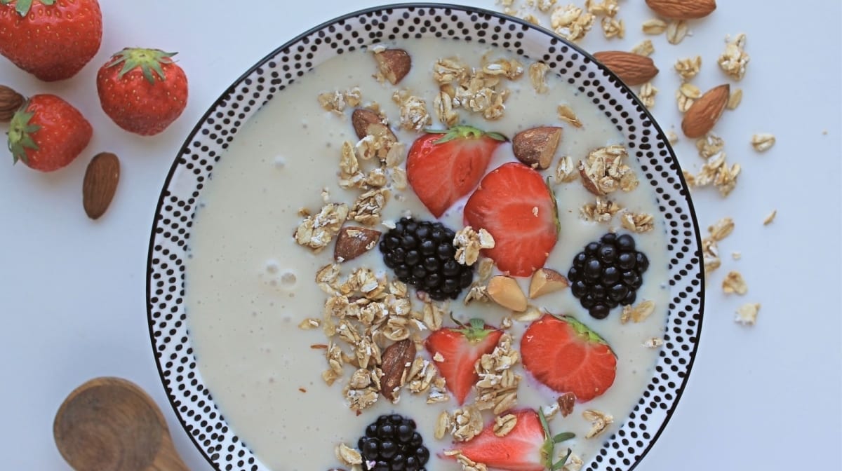 Koldskålen er toppet med sukkerfri havregryns crunch med mandler og friske søde bær. Havregryn er en god og sund kulhydratskilde og er fyldt med kostfibre. Mandler har det højeste protein indhold af alle nødder, og kan bruges som et værdifuldt supplement i kosten. De er særligt høje i mono-umættede fedtstoffer og oliesyre, og har vist at tilbyde sundhedsmæssige fordele.
