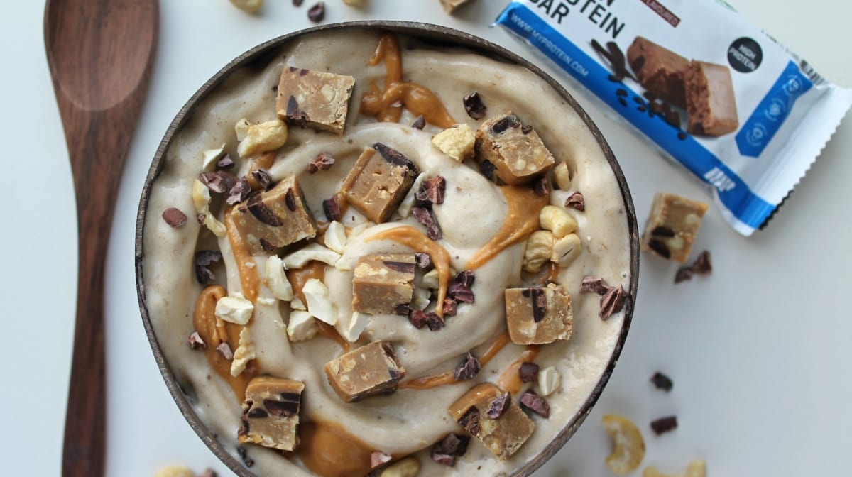 - Kom din nicecream blanding i en skål og top gerne med vanilje cashewsmør, vanilje proteinbar, hakkede cashewnødder og kakaokerner.