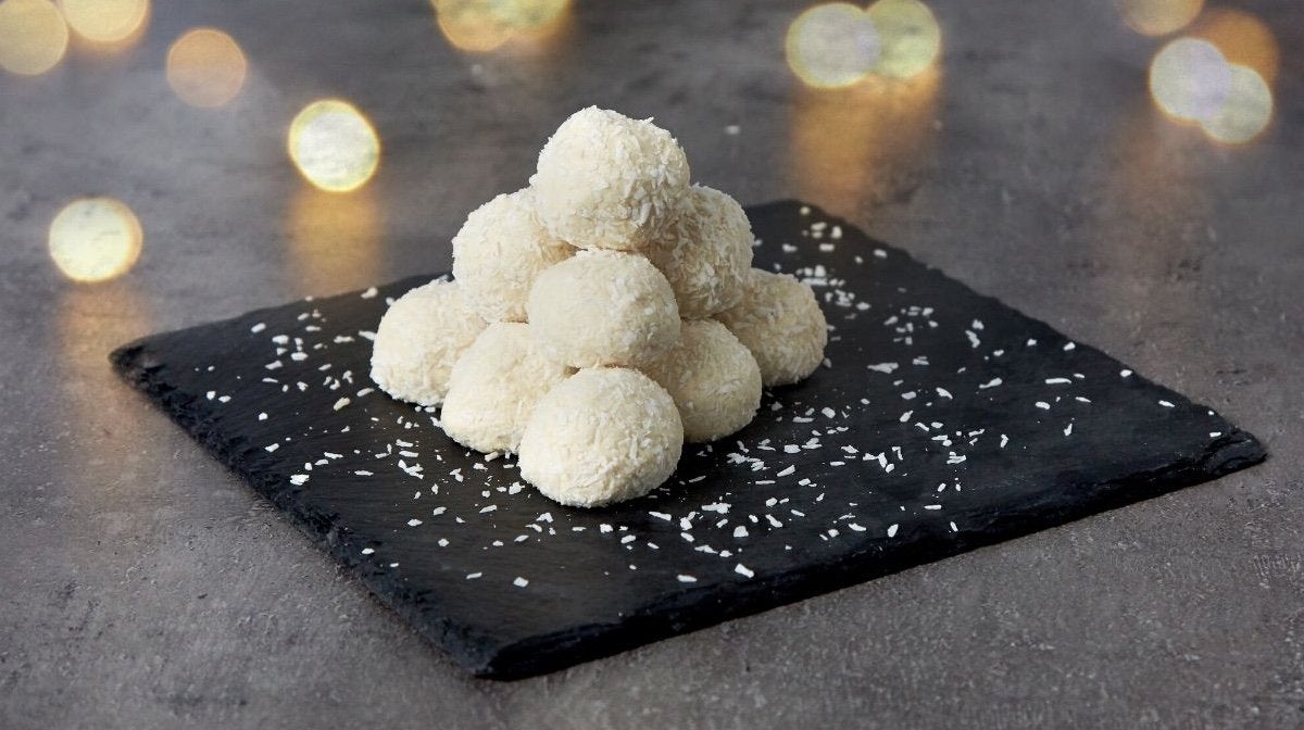 - Rul hver kugle rundt i en skål med revet kokos, indtil den er fuldstændigt belagt.