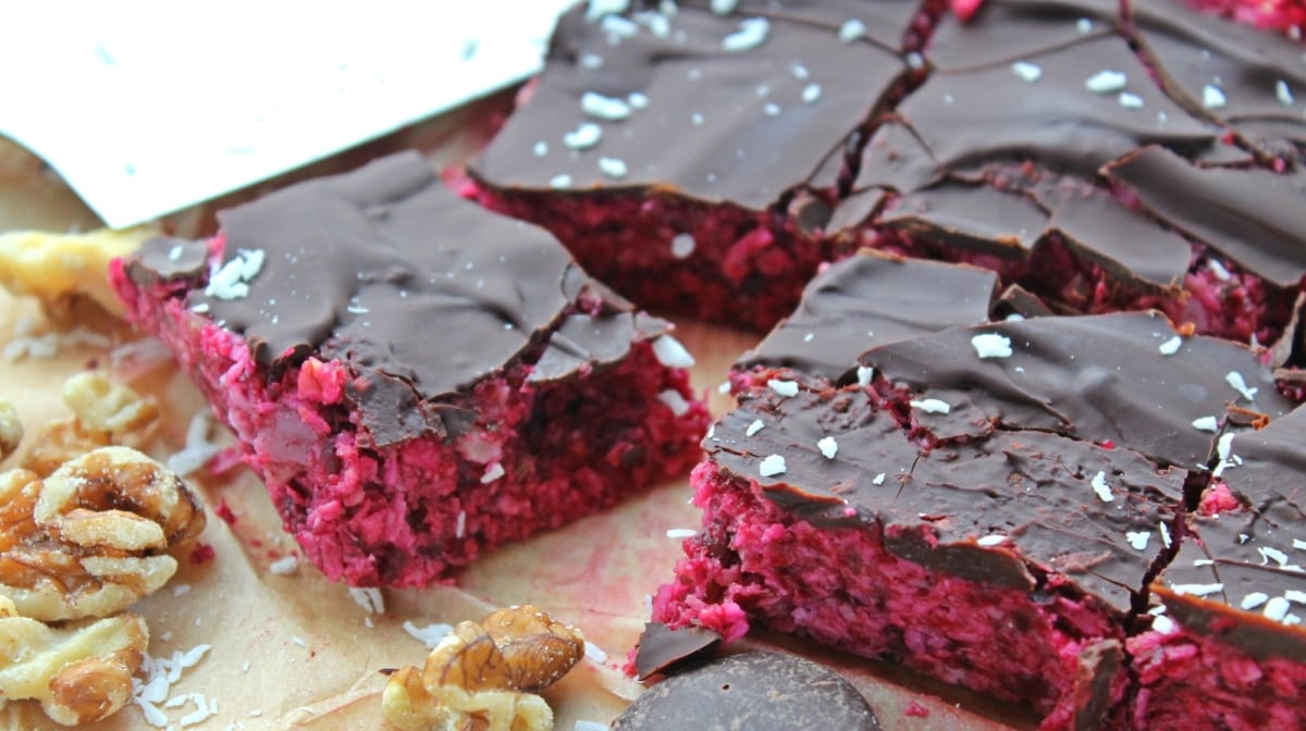 Kokosraspen og valnødderne tilføjer en lækker smag, sunde og essentielle fedtstoffer og selvfølgelig protein, hvorfor disse rødebede proteinbarer er perfekt som en pre-workout snack, da rødbede rent faktisk er lidt af en booster til dine træninger, og proteiner sørger for at forkæle musklerne. Barerne er toppet med lidt chokolade til den søde tand.