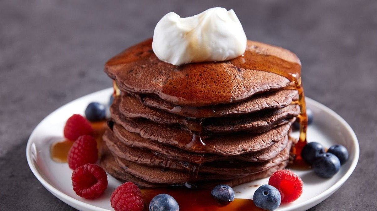Disse lækre chocolate chip og kakaopandekager fra Steph Elswood er en nem gevinst for den store dag, og de er faktisk også helt veganervenlige.
