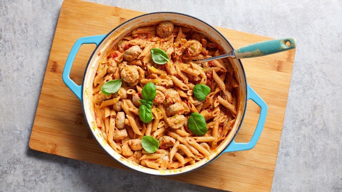Er du blevet en lille smule træt af kylling, ris og broccoli til din meal prepping? Jamen så synes vi, at du skal give dig i kast med en sund pasta opskrift som denne, der også indeholder fedtfattig svinepølse. Nu du er i gang, så få endnu mere inspiration fra vores andre sunde meal prep opskrifter.