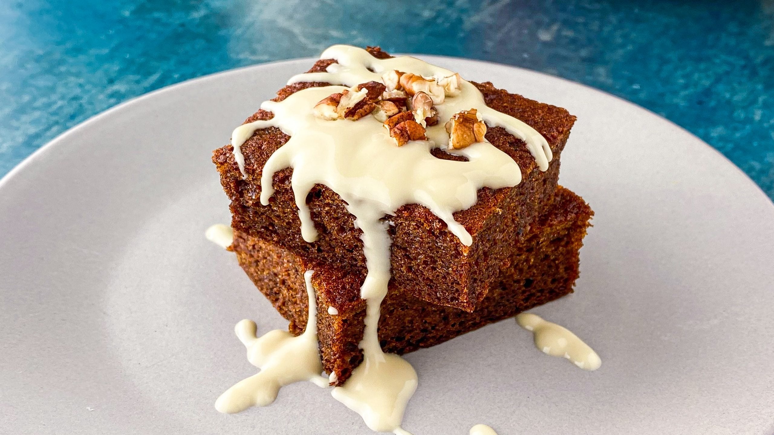 - Lad den køle af i 5 minutter, inden den skæres i 6 lige store firkanter. Dryp dem med masser af smeltet hvid chokolade Protein Spread og et drys hakkede pekannødder, og nyd dem!