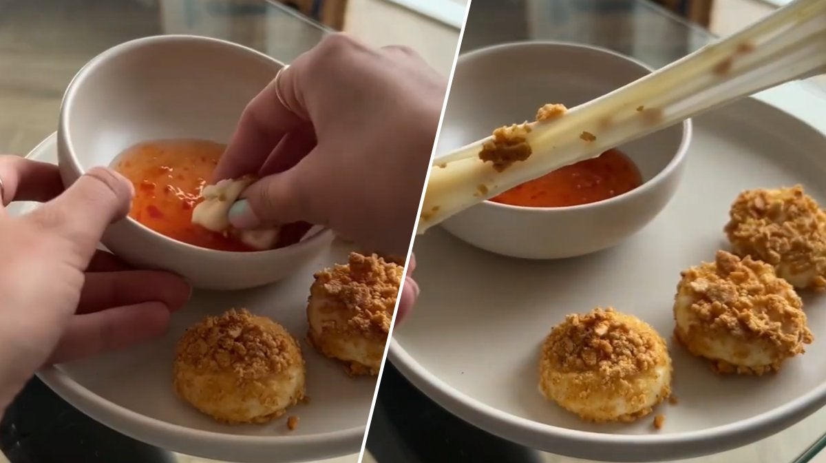 - Pak hver ost ud og dyp den i æggeblandingen. Sørg for, at de er helt dækket, og rul dem derefter i de sprøde krummer, indtil de er helt dækket.