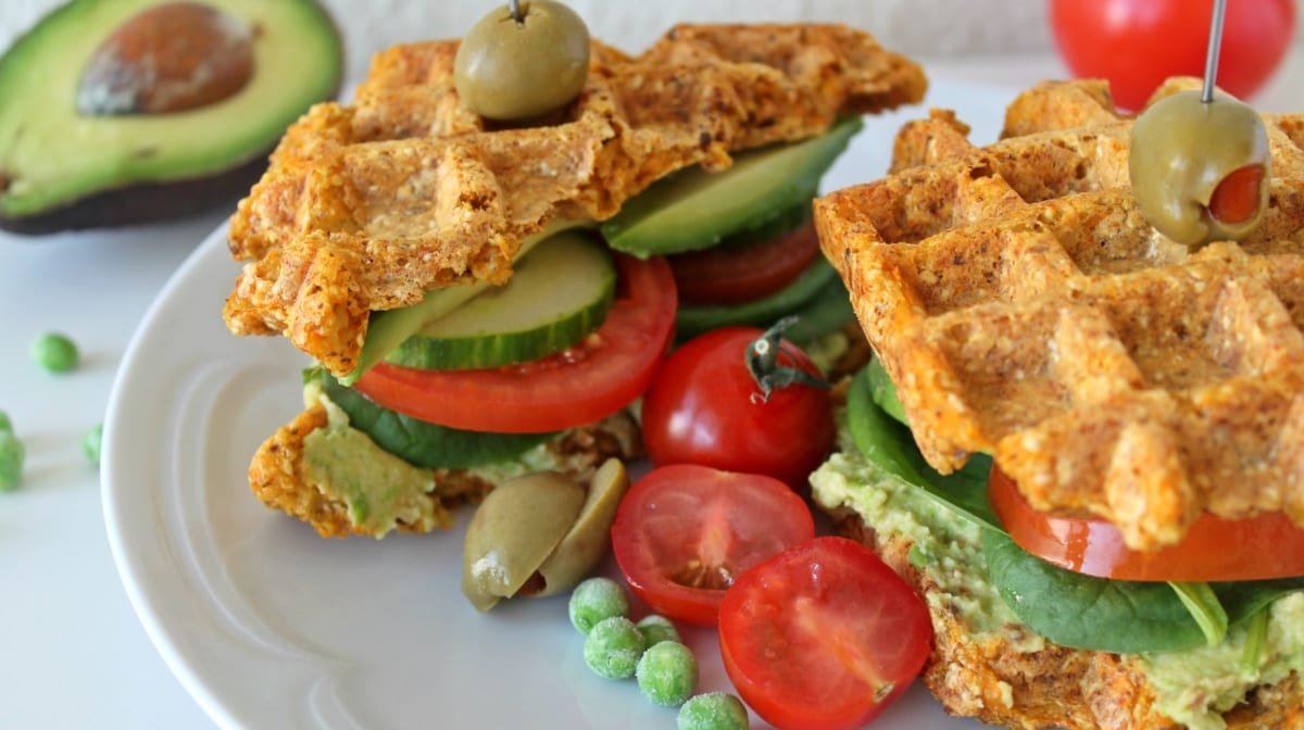Kom ærtehummus og de ekstra grøntsager ind i vaflerne. Voila! Nydes på alle tider af døgnet.
