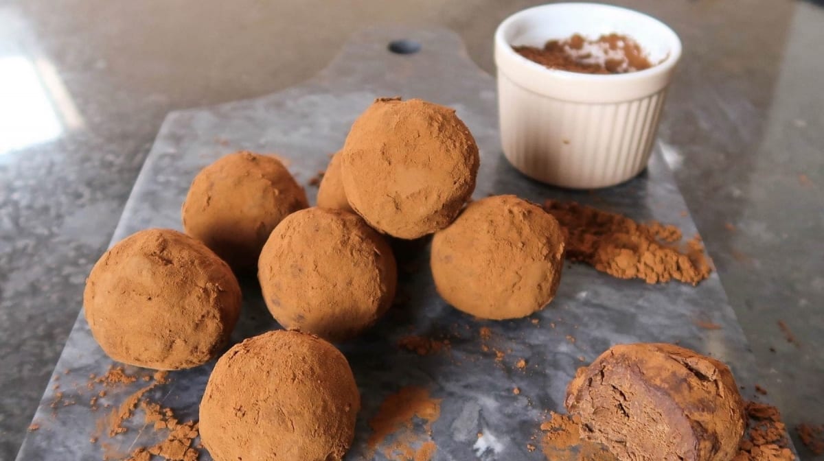 - Rul blandingen i 8 små kugler og rul hver kugle i kakaopulveret.