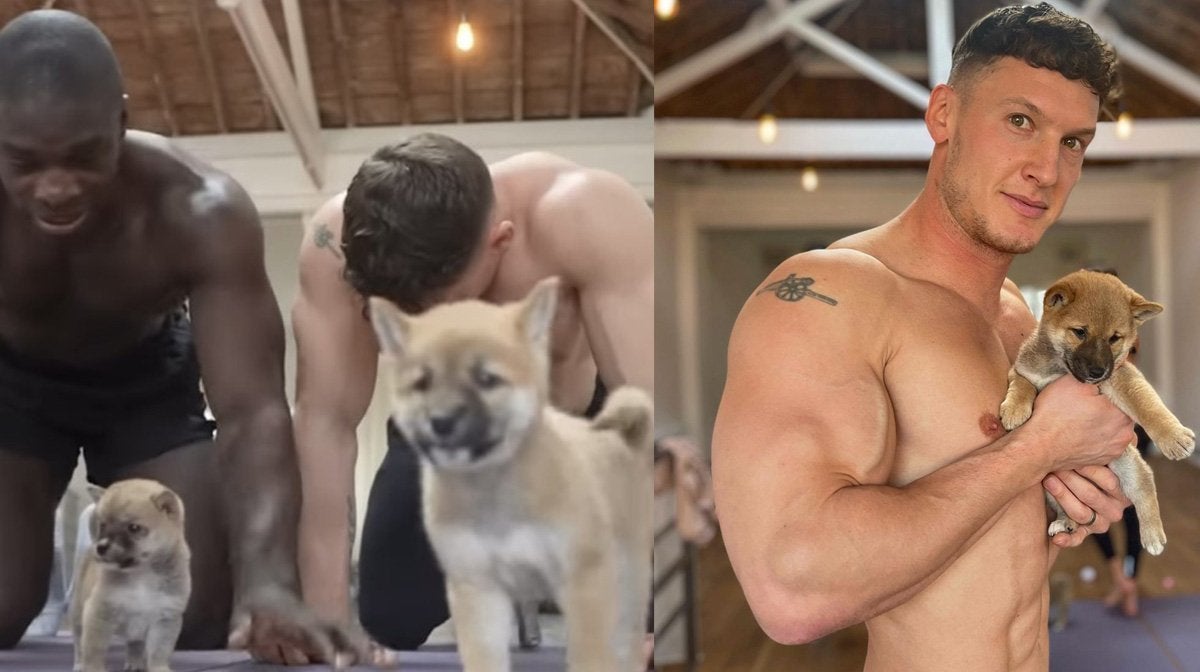 Da Matt og Paul gik ind i child's pose, sluttede en gruppe Shiba-hvalpe sig til dem og løb rundt og var en kærkommen distraktion for parret.