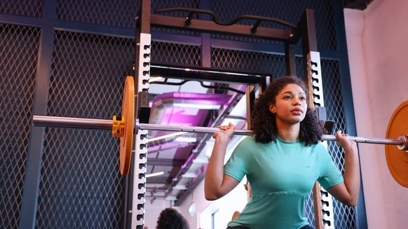 - Placer vægtstangen på dine skuldre med hænderne i et lidt bredere greb end skulderbredde, og placer fødderne i hoftebredde fra hinanden.