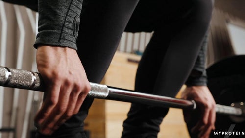 - Læn dig fremad, tag fat i vægtstangen, og rul den over tæerne, skinnebenene og op på lårene. Den skal nu sidde omkring 3 cm under dine hofteben.